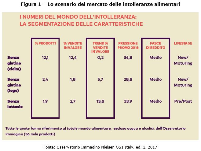 Sono 4.572 i prodotti alimentari venduti nel circuito della distribuzione moderna di tutta Italia che, dall’analisi dell’Osservatorio Immagino, presentano sulle confezioni i claim e i loghi “senza glutine” e “senza lattosio”. Rappresentano il 12,8% dell’offerta complessiva del largo consumo confezionato (acqua e alcolici esclusi) e nel 2016 hanno sfiorato i 3 miliardi di euro di vendite, in crescita dell’1,2% rispetto all’anno precedente. Nel 2016 i prodotti destinati alle intolleranze alimentari hanno raggiunto il 13,7% di quota a valore sul mass market monitorato dall’Osservatorio Immagino.