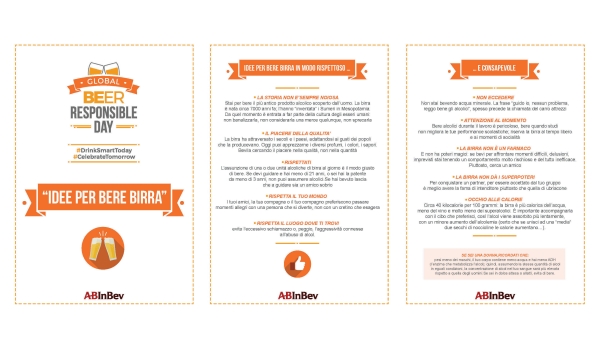 Inoltre, per un approccio il più possibile completo allo smart drinking e per rivolgersi a ogni soggetto potenzialmente coinvolto, AB InBev ha sviluppato e approfondito le dieci idee in tre versioni differenti, pensando cioè a interlocutori con necessità e approcci radicalmente diversi. La comunicazione sul consumo responsabile si rivolge quindi in prima istanza ai giovani, ma non dimentica gli altri attori coinvolti e coinvolgibili nello scenario della promozione del consumo responsabile. Gli stessi messaggi vengono infatti riformulati come indicazioni utili per genitori e insegnanti, facendo così emergere bene le naturali, ma spesso non così esplicite, differenze nel punto d’osservazione e nelle argomentazioni. Un approccio omnicomprensivo in linea anche con il programma di realizzare nei prossimi mesi un intervento pilota in alcune scuole superiori. Si tratta del primo passo di un progetto che vuole aumentare la consapevolezza dei consumatori, soprattutto nella fascia dei neomaggiorenni, una delle più sensibili al tema.