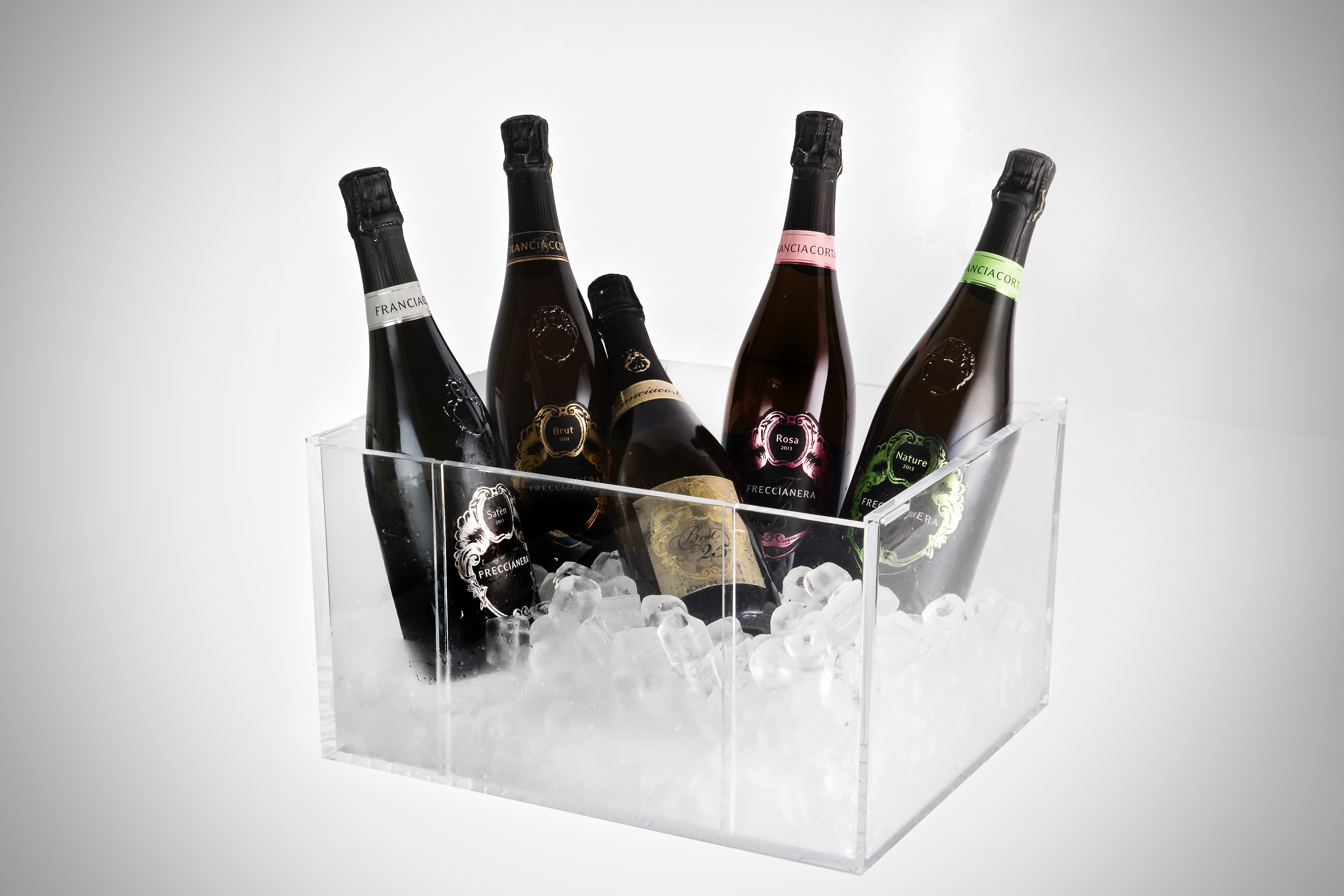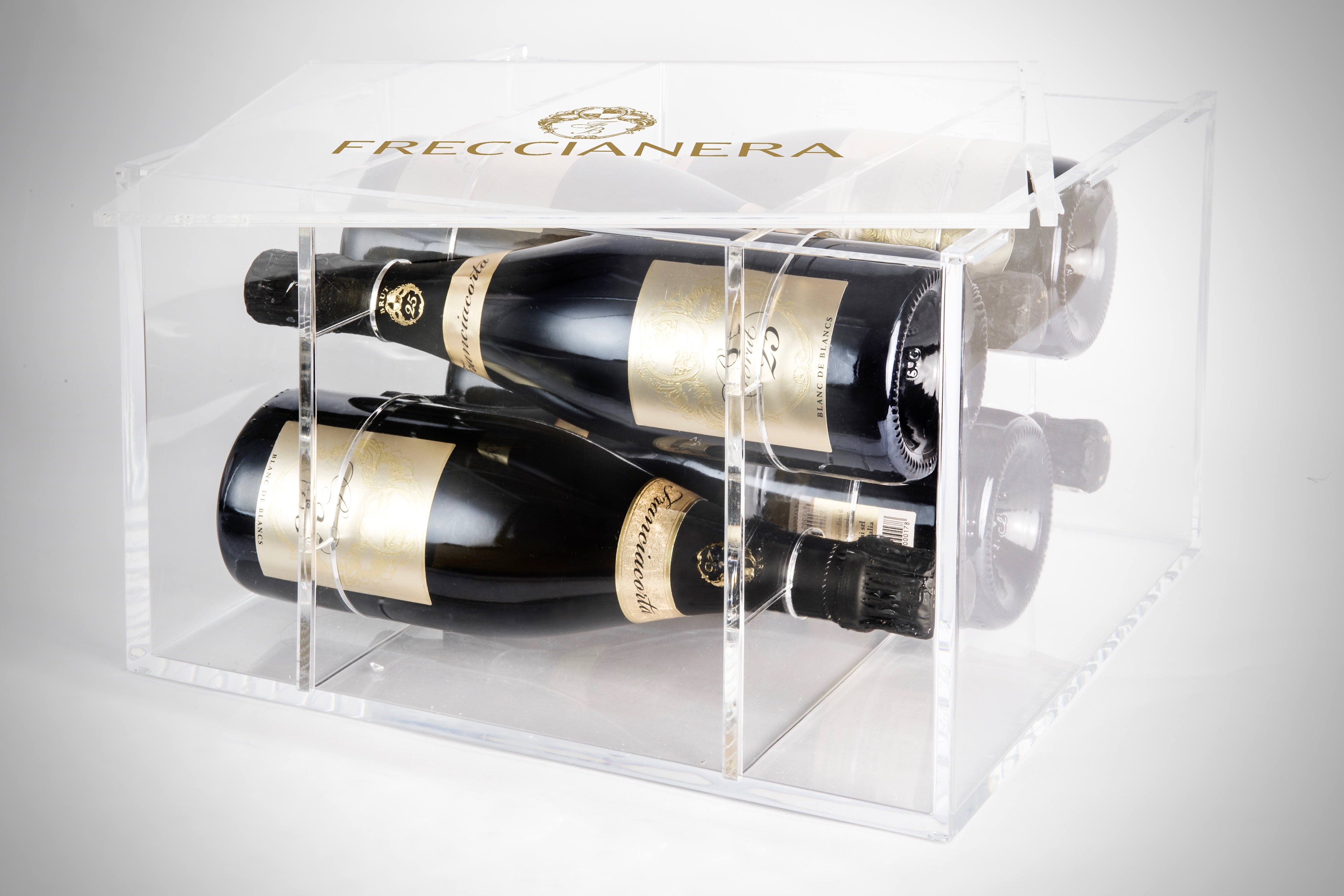 Si chiama ARIA ed è una cassetta in acrilico trasparente e cristallino da sei bottiglie, a scelta tra i Freccianera proposti da Fratelli Berlucchi: Brut, dal bouquet agile e fresco e dal sapore secco e brillante; Rosa, realizzato con aggiunta di Pinot nero vinificato in rosato, dal sapore fine e armonico; Satèn, dal caratteristico perlage sottile, dal profumo raffinato e dal sapore morbido e carezzevole; infine Nature, pieno e armonico, particolarmente secco perché ottenuto senza aggiunta di liqueur.