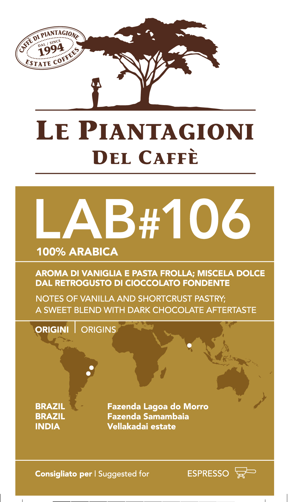 LAB#106, miscela 100% arabica, in fase di certificazione da parte di CSC. La compongono tre caffè di singola piantagione delle Fazenda Lagoa do Morro e Samambaia in Brasile e Vellakadai estate in India; si contraddistingue per l’aroma di vaniglia e pasta frolla, il gusto dolce con un retrogusto di cioccolato fondente.