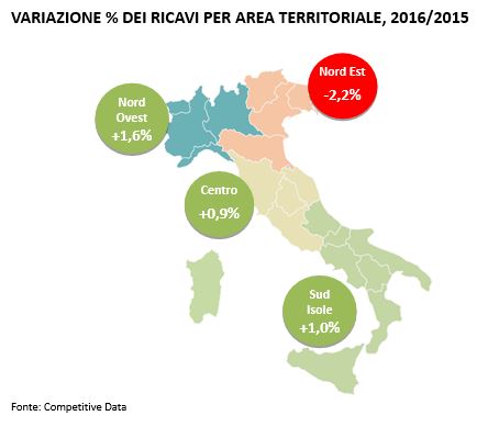 RICAVI IN LIEVE AUMENTO - I ricavi complessivi registrano una lieve crescita dello 0,5% nel 2016, con il Nord Ovest che registra la crescita più sostenuta (+1,6%), seguito da Sud e Isole (+1,0%), e dal Centro (+0,9%), in calo invece il Nord Est con una flessione del 2,2%. A livello regionale la regione Puglia mostra la crescita maggiore, +18,6%, mentre invece la regione Marche registra una flessione del 12,9%.