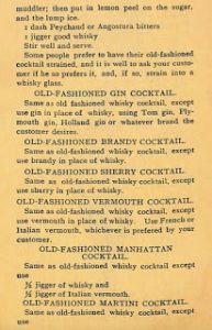 Di certo l’Old-Fashioned è uno dei drink storici della mixology. Detto questo, nel 1800 con la parola cocktail si indicava in modo generico una bevanda alcolica stimolante e dal carattere deciso a base di uno spirit, zucchero, acqua e bitter. Il termine cocktail compare per la prima volta infatti il 20 marzo 1798 sul giornale Morning post and gazetter di Londra in un articolo di cronaca dedicato ai debiti di alcuni uomini politici in diversi pub londinesi.