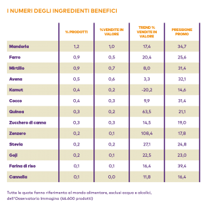 Dall’analisi dell’Osservatorio Immagino spiccano anche le performance della quinoa, con una crescita annua a valore del 63,5%. La quinoa è ormai inserita nello 0,3% dei prodotti alimentari di mass market ed è presente in diverse categorie merceologiche (dalle insalate di quarta gamma ai piatti pronti). Infatti gli acquisti si sono spostati dalla quinoa al naturale verso i prodotti ready-to-eat, più comodi e che semplificano la preparazione di questo pseudo-cereale andino.