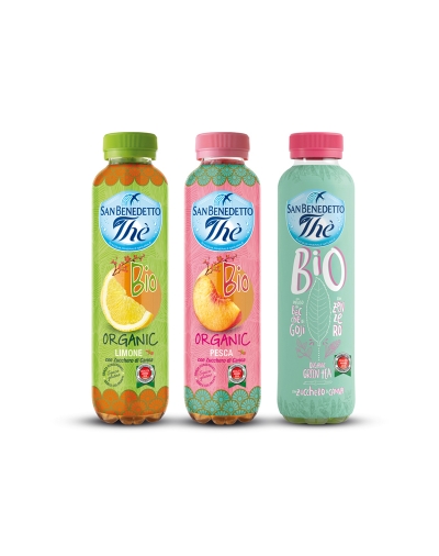 Thè BIO San Benedetto è la linea di thè freddi preparata con ingredienti derivanti da coltivazione biologica, con aggiunta di zucchero di canna, proposti nei gusti Limone, Pesca e nella nuova ricetta dissetante Verde BIO con Zenzero e infuso di Bacche di Goji, disponibili nel formato da 0,40L, ideale per l’autoconsumo e particolarmente distintivo.