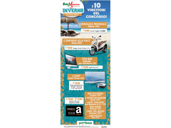 Come per la prima estrazione, altri 10 vincitori si sono aggiudicati importanti premi. Un voucher viaggio da 5.000€ va al cliente Terrazza Triennale di Milano, uno scooter Piaggio a L’Emporio alla Pace di Roma, un Apple iMac 5K da 27’’ è stato vinto dal Foxi Bar di Abbadia San Salvatore (SI), una tv da 55’’ ed un videoproiettore portatile vanno a L’Oasi di Acqui Terme (AL).