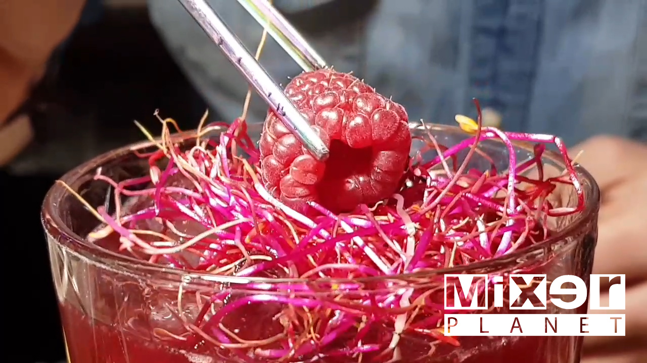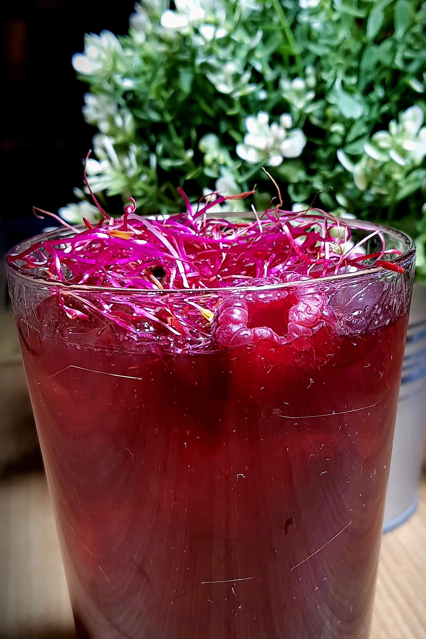 Beet Flower, ovvero: sciroppo di lampone, centrifuga di barbabietola, gin, vino rosso e top di ginger beer.