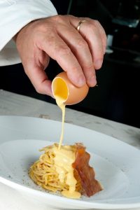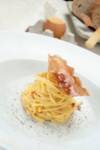 Una versione della carbonara, tra le migliori come l’hanno definita molti critici gastronomici e che lo chef ha letteralmente portato in tutto il mondo: come piatto gourmet da Hong Kong a Pechino e come cibo di strada al Salone del Gusto del 2016, ad esempio.