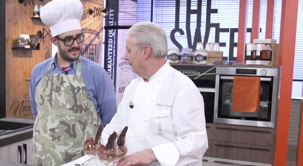 Bicchiere di mousse al cioccolato con sbrisolona e mandorle salate