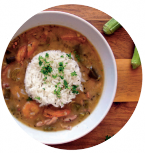 Senza ombra di dubbio è la seconda ricetta più famosa di New Orleans: il Gumbo, una densa e speziata zuppa di pesce che, come la Jambalaya, prevede anche una versione con carne di pollo o maiale (o tutte e due!). Oltre alle verdure e al brodo di pesce, fatto con chele di granchio, a cui poi si possono aggiungere gamberi, cozze, ostriche e pesce bianco, l’ingrediente tipico del Gumbo è l’ocra, pianta tipica del Sud degli Stati Uniti importata dall’Africa. Da cui forse questo succulento piatto ha preso il nome, visto che in lingua bantù ocra si dice ki ngombo, da cui è facile trovare somiglianze con il nome della zuppa di pesce della Louisiana.