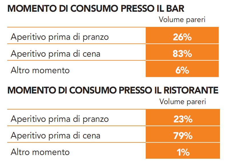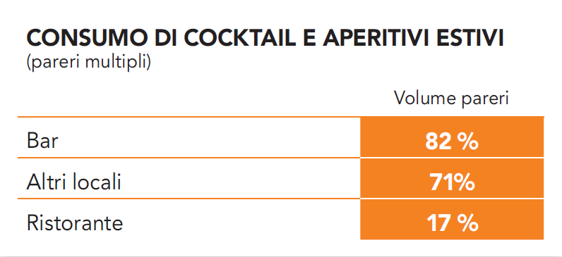 Nei 12 mesi i cocktail più citati sono stati: Negroni, Gin Tonic, Cuba Libre, Margarita, Martini, Alexander, Bloody Mary, Bellini, Rossini, Manhattan. Questi i cocktail molto citati stagionalmente che si aggiungono a quelli già elencati: primavera – estate : Mojito, Caiphiroska – Caipiriña, Piña Colada, Daiquiri, Sex on the beach; d’inverno: Ski Wasser. Molte menzioni anche per prodotti industriali quali, nell’ordine, Campari, Aperol, Martini, (tutti citati in numerose varianti), seguono le più generiche (sempre in ordine di frequenza): Spritz, “Bianco”, Spumante, Prosecco o semplicemente “Vino” e Birra (o “Bionda”, “Scura”, “Rossa”). Parlando di aperitivo, nella rete domestica, il vino è più citato della birra. Abbiamo visto che sono stati molto spesso scritti da appassionati ed intenditori, ciò è confermato dalla frequenza di termini quali: pre dinner, after dinner, fancies, long drink, cobbler, collins, cooler, cups, daisy, fix, fizz, grog, highball, julep, rickey, siling, smash, toddles, zombie ecc.