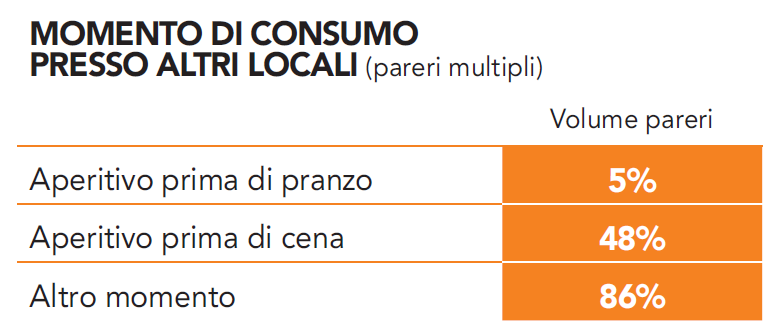 Precisiamo che se per Bar e Ristorante, Altro momento è spalmato su tutta la giornata, nel cluster Altri Locali (che ricordiamo include locali di intrattenimento e divertimento, ad es. le discoteche, i chioschi, i chiringuitos). Altro momento è concentrato nel dopo cena. Gli aperitivi ed i cocktail estivi nel canale Ho.Re.Ca. sono molto consumati anche come after dinner.