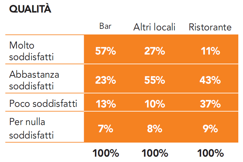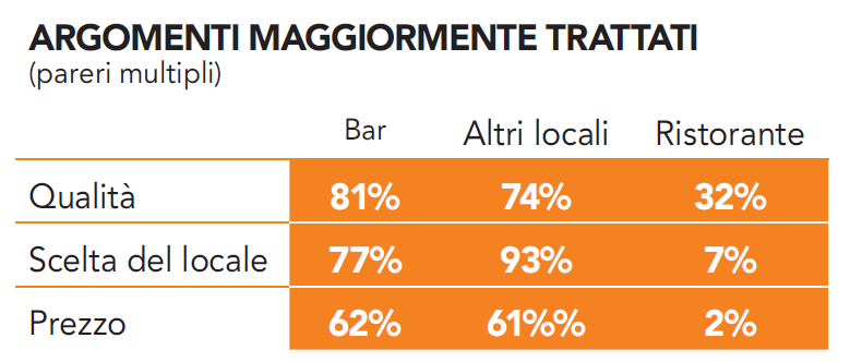 Le opinioni rinvenute nel web domestico, si sono aggregate, per i tre cluster Bar, Altri locali e Ristorante, nei seguenti item (pareri multipli):