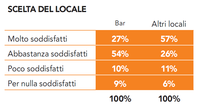 Nel cluster Bar abbiamo accorpato: bar-caffè senza pretese; i bar-pasticceria dove la consumazione è prevalentemente al tavolo; i cocktail bar – american bar – lounge bar intesi come luoghi di aggregazione e tendenza; le birrerie – i pub – i birrifici; i wine bar – le mescite – le enoteche – i locali da degustazione.