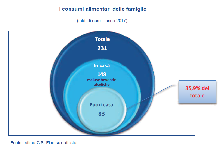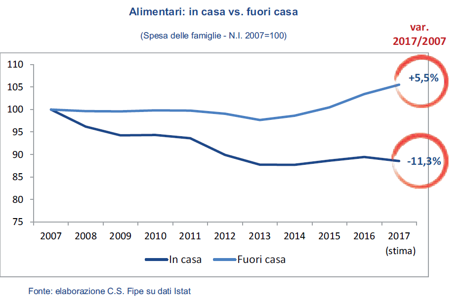 L’impatto della crisi sui consumi alimentari in casa (-11,3% pari a una flessione di 16,9 miliardi di euro tra il 2007 e il 2017 ha fatto in modo che il peso della ristorazione sul totale dei consumi alimentari guadagnasse ancora qualche posizione, rafforzando la tesi che vede gli italiani come un popolo a cui piace stare fuori casa. In particolare la sola ristorazione ha guadagnato una domanda di 5,5 miliardi di euro. Il quadro che ne emerge è di sostanziale ottimismo, il fuoricasa vale ormai il 36% nel 2017 del totale dei consumi alimentari delle famiglie con un trend di moderata ma costante crescita. Anche rispetto all’ Europa, dove la ristorazione con i suoi 561 miliardi di euro è la cartina di tornasole non solo dello stato di maturità delle diverse economie europee ma anche dei diversi modelli di consumo che ne caratterizzano le società, l’Italia dal punto di vista dei valori assoluti, è il terzo mercato della ristorazione dopo Regno Unito e Spagna.