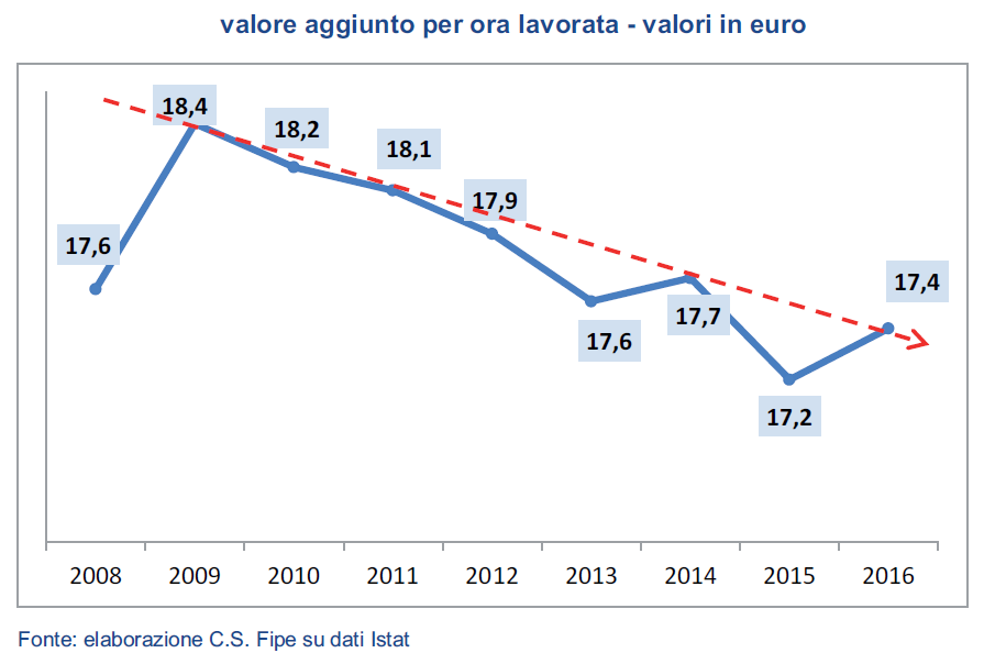 Non mancano, tuttavia, le ombre, resta elevato il turnover imprenditoriale, nei primi nove mesi del 2017 2016 hanno avviato l’attività 10.835 imprese mentre 19.235 l’hanno cessata determinando un saldo negativo pari a 8.400 unità e la produttività rimane sotto i livelli toccati prima della crisi. La produttività delle imprese della ristorazione non soltanto è bassa, ma anziché crescere si riduce. Attualmente è al di sotto di quasi sei punti percentuali rispetto al livello raggiunto nel 2009.