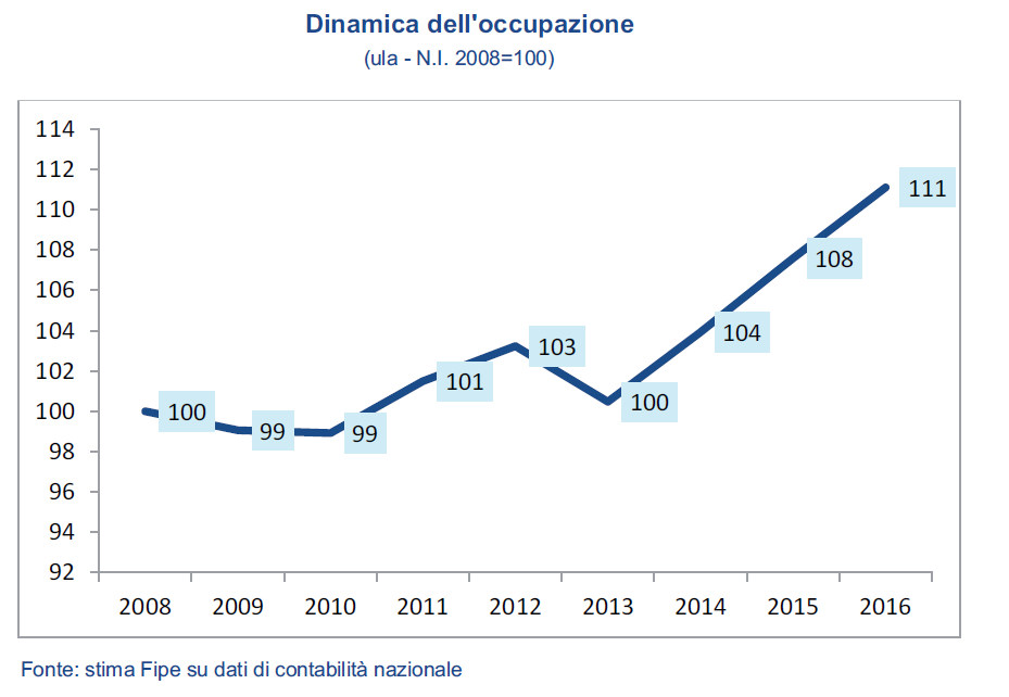 Sotto il profilo dell’occupazione il settore si conferma tra i pochi in grado di creare nuovi posti di lavoro con una crescita del 3,3% sull’anno precedente, d’altra parte il lavoro resta la componente essenziale per la produzione dei servizi di ristorazione.