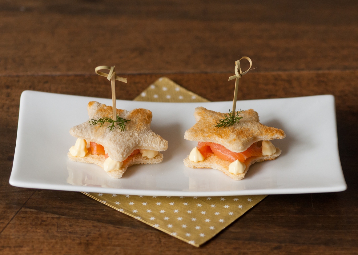Un menu delle Feste tutto a base di Mayonnaise Kraft, che oltre al sapore, può sfoderare per Natale anche la sua capacità di guarnire e decorare i piatti. La proposta prevede due portate a base di pesce, adatte non solo al giorno di Natale, ma anche alla cena della Vigilia: ecco allora tartine a stella con salmone, Mayonnaise Kraft e aneto, un antipasto sfizioso in cui i piccoli di
