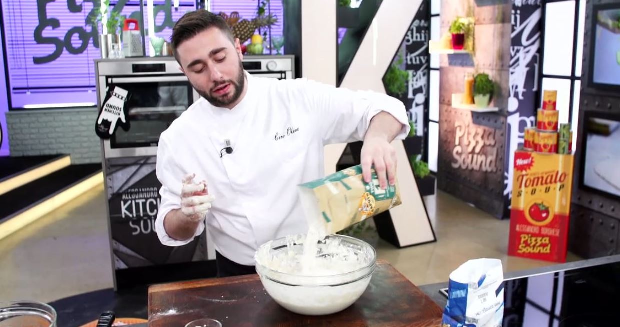 Partite preparando l’impasto. Prendete una ciotola aggiungete l’acqua e sciogliete il lievito al suo interno. Ora aggiungete la farina. Per questo impasto utilizzate due tipi di farina: per prima usate 640 g di farina tipo (00) e, in un secondo momento aggiungete 160 g di farina tipo (1). Durante la lavorazione dell’impasto aggiungete il sale prima di aggiungere le seconda tipologia di farina. Una volta pronto l’impasto adagiatelo in una ciotola e copritelo con un panno umido. Lasciatelo poi riposare per 16 ore.