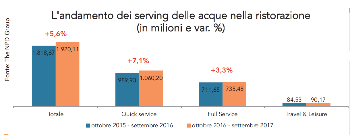 Oltre 100 milioni di consumazioni in più. Il bilancio registrato alla voce “acque” nei dodici mesi compresi tra ottobre 2016 e settembre 2017 non lascia dubbi: la ripresa inizia a fare sentire i suoi primi, tanto attesi effetti. A certificare l’incremento di serving della bevanda largamente più richiesta nella ristorazione sono i dati rilevati da NPD Group che restituiscono la fotografia di un mercato in crescita. «Nell’arco temporale della rilevazione – afferma Matteo Figura, responsabile Foodservice NPD in Italia – abbiamo registrato un incremento del 5,6% rispetto all’omologo periodo compreso tra ottobre 2015 e settembre 2016. E al risultato hanno concorso tutti i tre canali in cui si articola in fuoricasa. Il quick service – il segmento cioè composto da bar, fast food, locali take away, che nel caso delle acque assorbe oltre la metà delle consumazioni – ha messo a segno una progressione superiore al 7%. Meno brillante, ma pur sempre in pieno territorio positivo, è anche il risultato del full service, ovvero del canale che rappresenta la ristorazione tradizionale e che incide per il 38,3% sui serving della bevanda: in questo caso, l’aumento è del 3,3%. Ma bene ha fatto anche il canale Travel & Leisure, quello cioè che identifica il mondo dei locali notturni o comunque legati all’intrattenimento, e che dimensionalmente appare il meno significativo (pesa per il 4,7% sui consumi di acqua): qui si registra, infatti, una progressione del 6,7%».