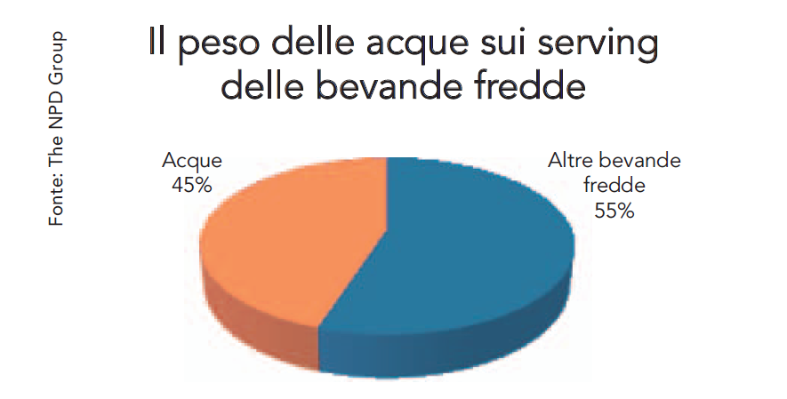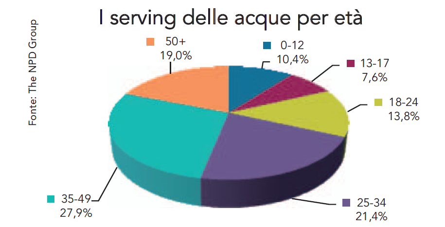 Ottima è stata poi la performance ottenuta dall’acqua lievemente frizzante. «A questa categoria – continua Figura – vanno ricondotti altri 38 dei già citati 100 milioni di serving addizionali. Certo, si tratta di un segmento molto circoscritto in termini volumetrici (pesa per l’8,5% sul totale), ma è anche quello che ha incassato l’accelerazione più marcata, pari al +31,5%, grazie a un posizionamento alto, che ben si sposa con menu raffinati e gourmet». Più contenuta è, infine, l’avanzata delle acque frizzanti. «Costituiscono il 13,5% delle consumazioni – osserva Figura – e, con 13 milioni di serving aggiuntivi, hanno limitato la propria crescita al +5,3%, facendo leva soprattutto sulle preferenze accordate dalla fascia adulta dei consumatori».