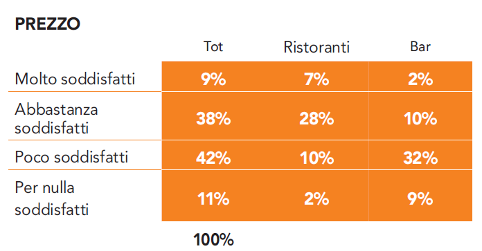 Analizziamo ora il livello di soddisfazione riguardo al prezzo, ripartito per locale dove viene consumata l’acqua.