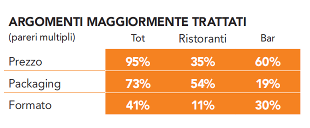 Ma quali sono gli argomenti affrontati? Prezzo, packaging e formato, conquistano il podio, con il prezzo nettamente in pole position. Al contrario gli aspetti qualitativi, organolettici e collegati all’impatto ambientale del prodotto sono decisamente trascurati; diversamente, quindi da quando si parla di acqua acquistata nella GDO e nella DO.