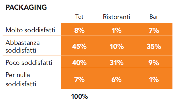 Anche la soddisfazione riguardo il packaging dell’acqua consumata presso l’Ho.Re.Ca. si concentra intorno ai valori medi – poco soddisfatti e abbastanza soddisfatti –; in questo caso non ci sono differenze significative tra ristoranti e bar.