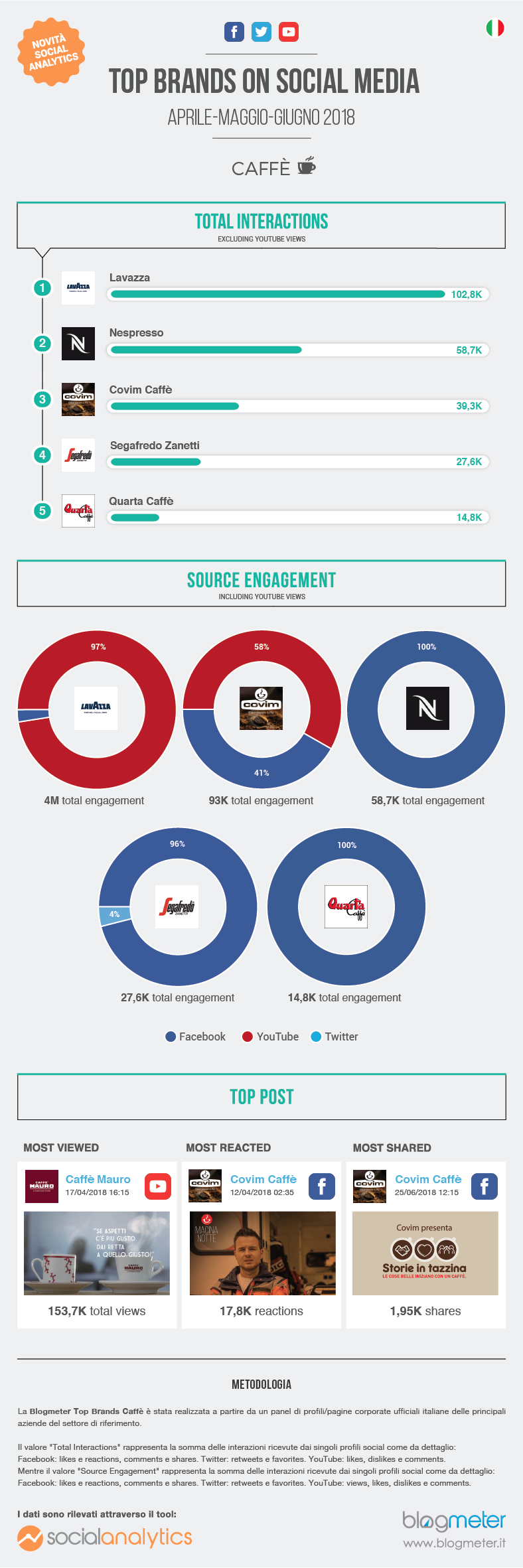Questo mese la tradizionale analisi Top Brands è stata dedicata al Settore Caffè. Per l’occasione sono state analizzate – nel periodo che va dall’1 aprile al 30 giugno 2018 - le performance di tutte le pagine ufficiali Facebook, Twitter e YouTube dei 30 principali brand di caffè presenti sul mercato italiano e che si rivolgono allo stesso. Ne è scaturita una classifica in cui Blogmeter ha evidenziato i primi 5 brand risultati migliori per interazioni totali (escludendo le views di YouTube) nel trimestre considerato. La classifica è stata costruita utilizzando il nuovo tool di Social Analytics, uno strumento migliorato sia dal punto di vista grafico sia nelle funzionalità, che permette di mettere a confronto non solo i diversi brand, ma anche i diversi canali social di un singolo brand.