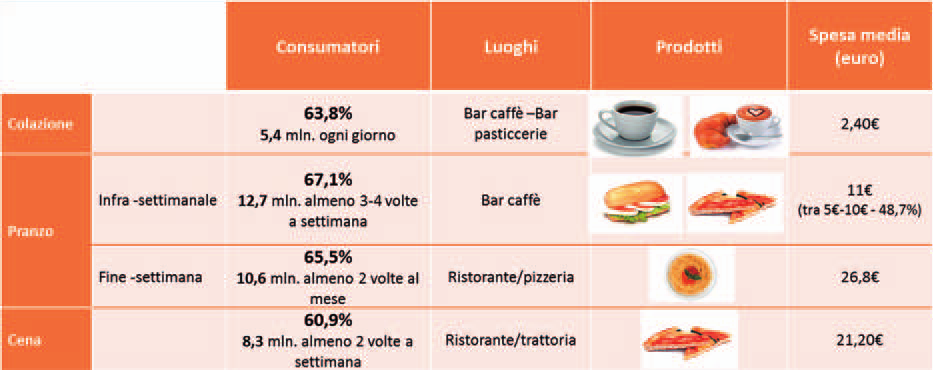 average consumer: 9,7 milioni che consumano almeno 2-3 pasti fuori casa in una settimana; sono in prevalenza uomini (51,8%), residenti al Centro Italia (29,0%) di età compresa tra i 18 e i 24 anni;