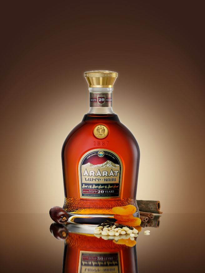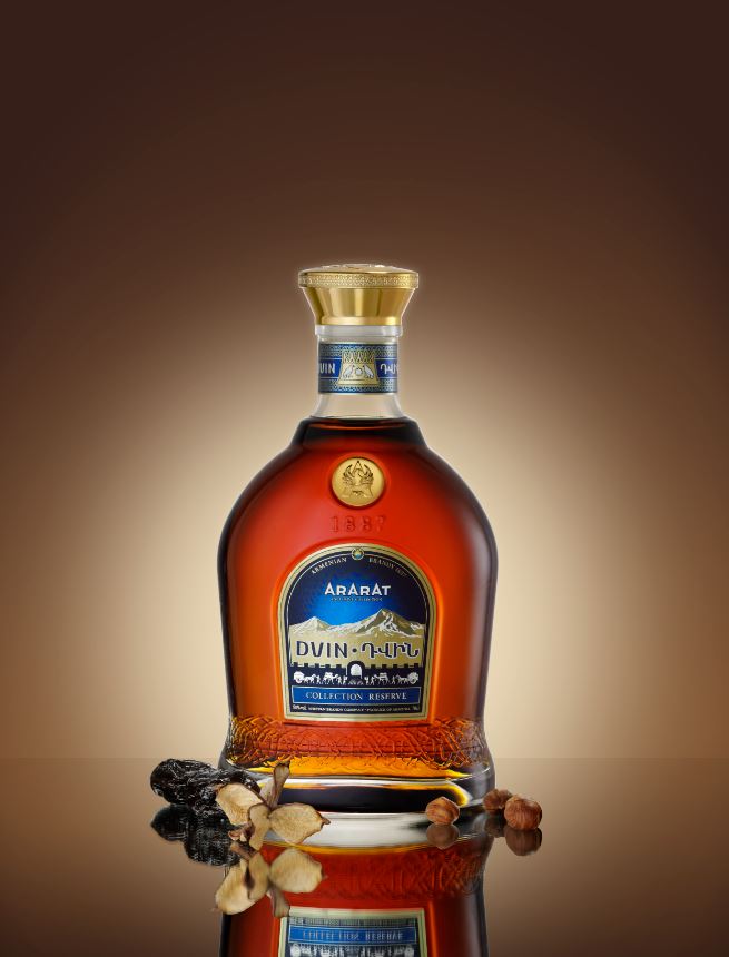 Dvin: Invecchiato 10 anni in botti di quercia, ha una gradazione di 50°, si caratterizza per un ricco colore ambrato, con sfumature intense mogano. L’aroma rotondo e speziato è bilanciato da note di frutta secca, mandorla dolce e spezie profumate che rivelano la ricca complessità del brandy. Prezzo al pubblico consigliato: 110€.