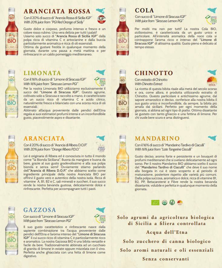 Solo agrumi da agricoltura biologica di Sicilia a filiera controllata, acqua dell’Etna, zucchero di canna biologico, aromi naturali e oli essenziali, senza conservanti e con una sferzata di gusto che trasmette tutta quell’energia che solo la natura riesce a sprigionare.