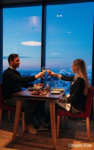 un’esperienza unica nel suo genere. Non seconda alla qualità del cibo, la location rappresenta un punto di forza non indifferente: il ristorante si trova su una piccola isola con vista fiordi che gli ospiti possono raggiungere solo tramite traghetto privato o, in maniera più esclusiva, in elicottero. All’arrivo si viene accolti da una tradizionale zuppa di molluschi per poi gustare il menu meteorologico, un’idea assolutamente local e stagionale. Questo menu viene infatti creato partendo dal meteo e dal pescato del giorno. Risalendo dal mare, si può prendere la storica funivia del monte Ulriken per cenare a 643 metri di altezza: Sky:Skraperen si trova letteralmente tra le nuvole. Posto sulla cima della più alta delle montagne di Bergen il ristorante offre vista panoramica sulla città e ricette tradizionali rivisitate in chiave moderna che prevedono, ancora una volta, ingredienti locali come per esempio la carne delle pecore che pascolano nelle vicinanze.