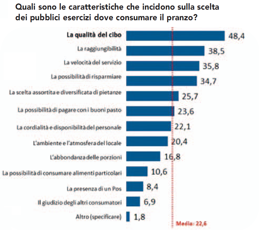 Le motivazioni per le quali i lavoratori preferiscono consumare il pranzo in un pubblico esercizio sono principalmente tre: la mancanza di tempo per prepararlo a casa, la voglia di evadere dalla routine dell’ufficio, il piacere di consumare un pasto caldo; a cui seguono molte altre motivazioni tra cui la convenienza e la possibilità di pagare con i buoni pasto. Per un lavoratore su due è la qualità del cibo il punto di forza del pubblico esercizio dove consumare il pranzo. Sono molto importanti anche la vicinanza al luogo di lavoro, la velocità del servizio e, da non trascurare, l’attenzione al portafogli. Anche in questo caso vi sono molte altre variabili che, tuttavia, sono assai meno rilevanti delle precedenti. Curiosa, soprattutto in questa fase in cui si discute di Pos e di sanzioni, la percentuale di appena l’8,4% di chi ritiene importante la presenza di un Pos all’interno del bar.