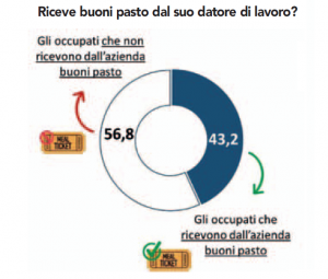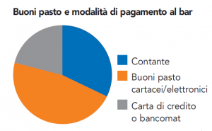 A proposito di buoni pasto si rileva che il 43,2% dei lavoratori dipendenti del campione (il 58% del totale lavoratori) li riceve dal proprio datore di lavoro. Come si vede sono ancora molti i dipendenti che non hanno a disposizione il servizio sostitutivo di mensa. Tra chi riceve i buoni pasto e frequenta il bar per il pranzo di mezzogiorno più del 50% paga in contanti o utilizza il pagobancomat.