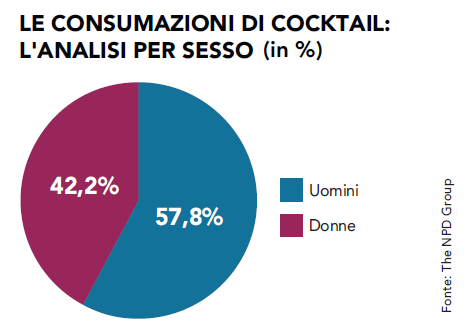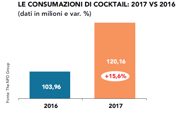 I numeri, insomma, testimoniano un ottimo stato di salute per Margarita, Negroni & co. Ma c’è di più. «La crescita di questo segmento – afferma Matteo Figura, responsabile Foodservice NPD in Italia – acquista ancora più valore se inserita in un contesto più ampio. E questo per almeno due ragioni. Innanzitutto, si deve considerare come l’incremento ottenuto dai cocktail vada collocato all’interno di un comparto, quello dei consumi fuori casa, che pure mostra tassi di sviluppo complessivi, ma che corre a ritmo nettamente più lento: le rilevazioni del primo trimestre del 2018 parlano infatti di un’accelerazione del settore pari all’1,8% in termini di visite e al 3% sul fronte della spesa. In secondo luogo, le maggiori consumazioni di cocktail si devono raffrontare con un andamento sostanzialmente stabile degli alcolici, attestati a circa 1,6 miliardi di consumazioni annue. Il che suggerisce come sia in atto un cambiamento dei gusti dei clienti, che sembrano apprezzare sempre più la mixability a discapito di altre categorie più tradizionali, come, per esempio, il vino. Prova ne è anche il fatto che i drink realizzati con mix di liquori o spirits guadagnano terreno all’interno della stessa complessiva categoria degli alcolici: la loro incidenza passa infatti dal 6,5% del 2016 al 7,4% del 2017».