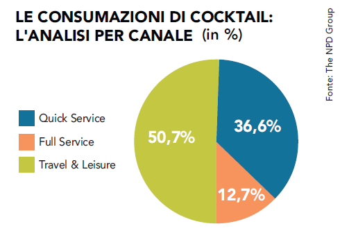 L’aumento del consumo di cocktail non si è però fatto sentire in modo analogo in tutti i canali. «A beneficiare in modo più sensibile del fenomeno – spiega Figura – è il comparto del Travel & Leisure, quello cioè che identifica il mondo dei locali notturni o comunque legati all’intrattenimento, ovvero quello che rappresenta la voce più importante se si analizzano le visite legate a questa categoria di bevande: qui i serving si sono apprezzati di quasi l’1%. Sostanzialmente stabile è invece il quick service, il segmento cioè composto da bar, fast food, locali take away, che incide per un non certo risibile 36,6% sulle consumazioni. In calo è, invece, il full service, ovvero il canale che corrisponde alla ristorazione tradizionale, il cui peso si riduce dal 13,4% del 2016 al 12,7% del 2017».