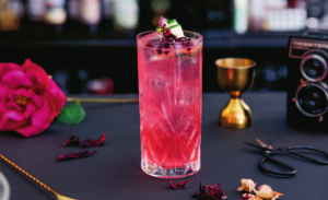 Rosmunda con 50 ml di vodka,, 30 ml di sciroppo di tea verde aromatizzato alle Rose e Karkade, 20 ml di limone, top di soda al cetriolo. Decorato con una fettina Foto: Chiara Nicolosi[/caption]