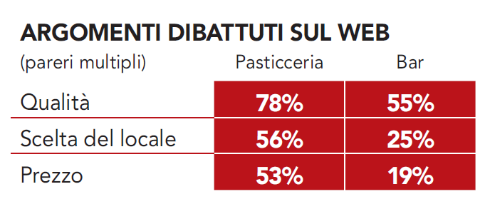 E in tema di soddisfazione delle aspettative cosa dice il web? Emerge che i soddisfatti della qualità dei prodotti consumati in Pasticceria sono l’84%, al Bar scendono al 69%.
