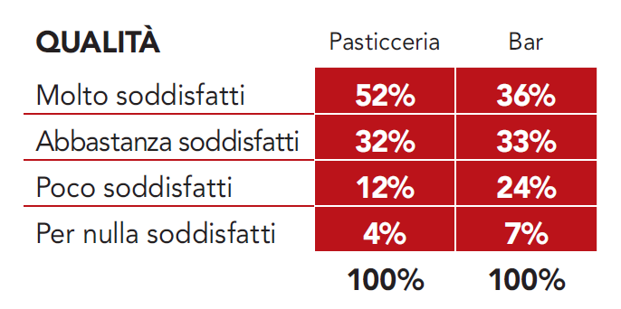 Molto spesso si sceglie il locale anche in base al tipo e alla qualità della “piccola pasticceria” proposta: ma una volta effettuata questa selezione, quanti sono poi realmente soddisfatti? Le percentuali sono incoraggianti: i soddisfatti della Pasticceria scelta in base all’offerta sono il 78%, quelli del Bar il 64%.