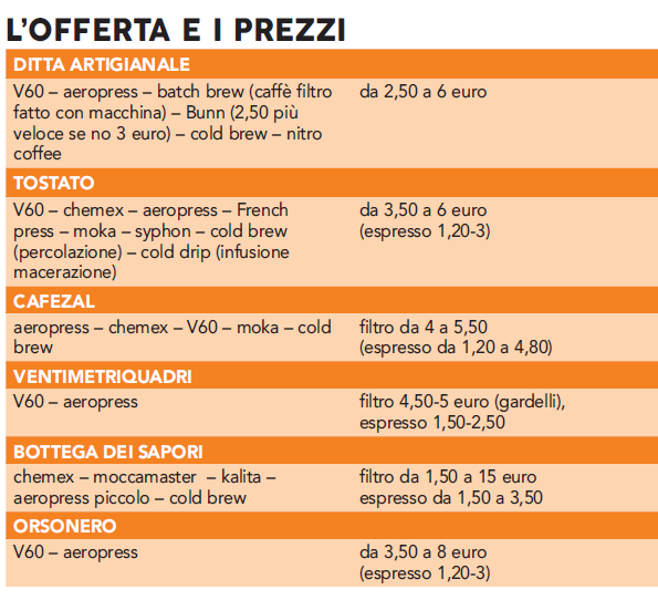 “È l’unica nota dolente, c’è questa assurda regola italiana per cui un espresso al bar costa come l’acqua, è scandaloso” dice Sanapo. “La sensibilità al prezzo è uno dei problemi maggiori che deve affrontare chi propone specialty oggi in Italia” dice Jopson. Uno dei vantaggi del caffè filtro, che non fa parte di una tradizione consolidata, è proprio l’accettazione da parte del cliente di un prezzo più alto. Ma c’è un’ultima considerazione. Dice Fioretto: “Oggi quando i miei clienti prendono un caffè da un’altra parte capiscono se è bruciato, rancido o ha problemi, prima un caffè valeva l’altro”. Un campanello d’allarme per tutto il settore? Forse i tempi sono contati per l’era del caffè unico. Ma anche per quello non all’altezza delle aspettative.