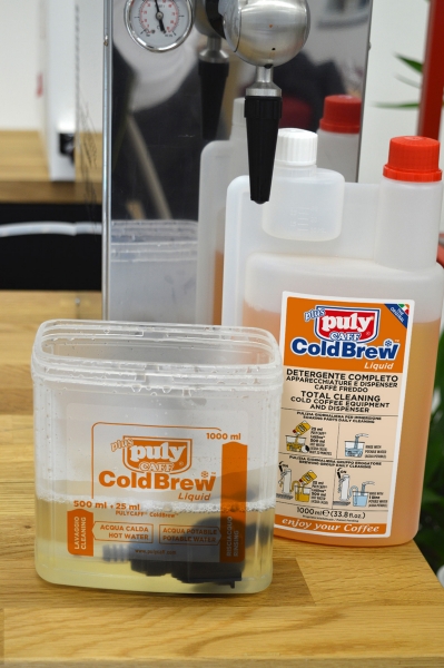 Per pulire il circuito interno, si versano 500 ml di acqua calda (non bollente) e 25 ml di puly Cold Brew “all in one” in un contenitore, quindi si stacca il tubo di aspirazione dalla tanica del caffè e si immerge il tubo di pescaggio nel liquido di lavaggio dando il via alla sua spillatura. Una volta svuotato il recipiente del caffè, si versa in esso 1 litro di acqua potabile fresca e si spilla tutto effettuando il risciacquo dell’impianto.