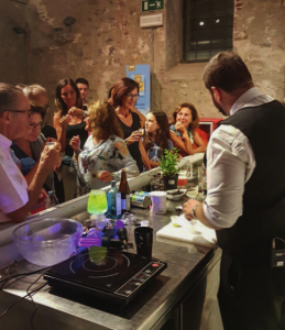 Miele nostrano e profumi caraibici, per un mix interessante che ha aperto i quattro incontri dedicati al mondo del bartending coniugato alla tradizione. Il Mielito è un drink nato proprio nello spezzino, che ricorda la preparazione del Mojito. Si differenzia per la presenza (al posto dello zucchero di canna bianco) del miele di Calice al Cornoviglio (il primo miele DOP d’Italia). Durante la serata, presentata dagli esperti delle Strade del Miele, sono state preparate alcune varianti. Una ad esempio con un Rum al miele al posto del classico rum chiaro cubano. Sempre nella stessa serata, è stato offerto un altro drink a base di vodka lemon, miele e soda, dissetante e rinfrescante (purché alcolico moderatamente). Ma se il miele è uno dei prodotti DOP usati per variare un po’ di ricette, ancora più intriganti le proposte dei mixologist AIBM. Partiamo con Gabriele Pagano, responsabile del Beach Event di Recco (GE). Il tema affrontato nella sua masterclass è stato l’utilizzo di tecniche molecolari da abbinare ai sapori del mare e alla mixologia moderna; nello stesso tempo la creazione di cocktail e finger food abbinati con tecniche molecolari.
