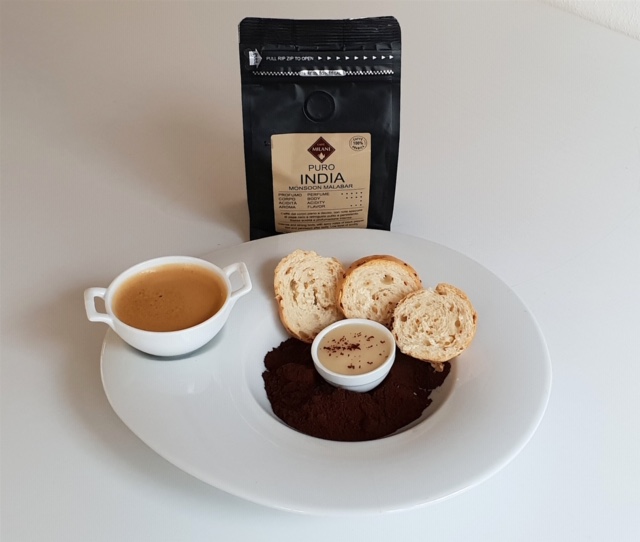 Protagonisti sono un caffè Puro India Monsoon Malabar di Caffè Milani e un filoncino di pane realizzato con cereali antichi, con segale e farro con le farine di CSM Bakery Solution. La preparazione è realizzata su un piatto fondo con un incavo sul bordo. Il caffè freddo si può ottenere con il coreografico cold drip (che fa gocciolare acqua fredda sul macinato; un’estrazione che si protrae anche 8-10 ore) oppure in infusione, ponendo in un recipiente acqua fredda unita a caffè macinato in modo grossolano; si fa riposare il tutto per una nottata quindi si filtra e versa in bottiglia, mantenendo al fresco. A 800 ml di questo caffè si uniscono 200 ml di linfa di mandorla e si mescola bene, versando in un sifone Nitro e caricando con una bomboletta di azoto prima di porlo in frigorifero. Si realizza quindi della terra di caffè, unendo 200 gr di burro, 200 gr di farina 00, 200 gr di farina di mandorle, 100 gr di zucchero di canna e 100 gr di caffè macinato India Monsoon Malabar: si versa il tutto in una planetaria e si impasta, formando un composto da stendere sul fondo di una teglia; inserire in forno a 160 gradi per 8 minuti: si forma una terra granulosa da porre alla base del piatto. Al centro della terra si pone un vasetto con della linfa di mandorla, nel caso il cliente la voglia spalmare sul pane, quindi la tazza con il caffè all’azoto sul bordo e il pane, da gustare con calma, assaporando i suoi sentori di nocciola e di cacao, in linea con i sentori di cioccolato e frutta secca a guscio del caffè.