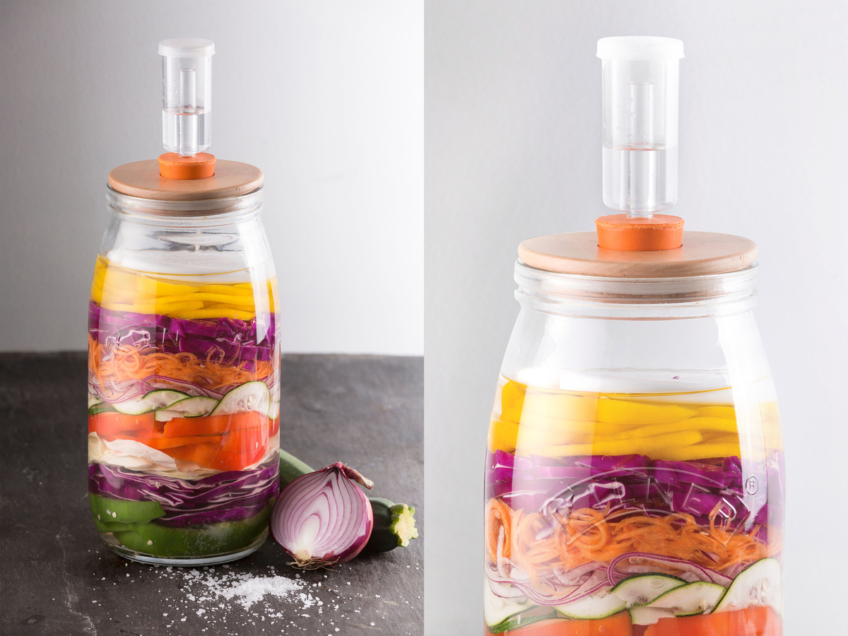 eterni, ma possono essere conservati in frigorifero o in dispensa per mesi, perché la fermentazione rende l’ambiente costituito dal cibo del tutto inospitale per microrganismi patogeni e funghi. Birra, sakè, idromele, sidro, Kefir, sono solo i più famosi risultati di un’attenta fermentazione ma non gli unici. Il set ideato da Kilner per realizzarla contiene un vaso da 3 litri, perfetto per la realizzazione ma anche la conservazione, un coperchio in legno che tiene fuori l’ossigeno, una camera stagna e un tappo che permettono il rilascio sicuro dei gas, due sassi in ceramica, per tenere sommersi i cibi sotto la salamoia di sale. Sono davvero pochi i passaggi da compiere ma devono essere tutti seguiti con cura. In primis, mettere l’alimento scelto in una ciotola, se necessario tritarlo, e cospargere il tutto con sale marino. Pestarlo poi per far uscire il liquido. Disporre il composto nel barattolo. Molto importante in questa fase è assicurarsi di lasciare uno spazio di testa al massimo di 2,5 pollici/6,5 cm. Ciò è indispensabile in quanto in fase di fermentazione i cibi e i liquidi si espandono. Sigillare il barattolo col coperchio, aggiungere camera stagna e tappo.Riempire poi la camera stagna con acqua. Lasciare fermentare dalle 4 alle 6 settimane. Vi consigliamo acqua filtrata e sale senza iodio per la preparazione. Se però volete saperne di più, potete consultare il libretto di istruzioni e il ricettario inclusi.