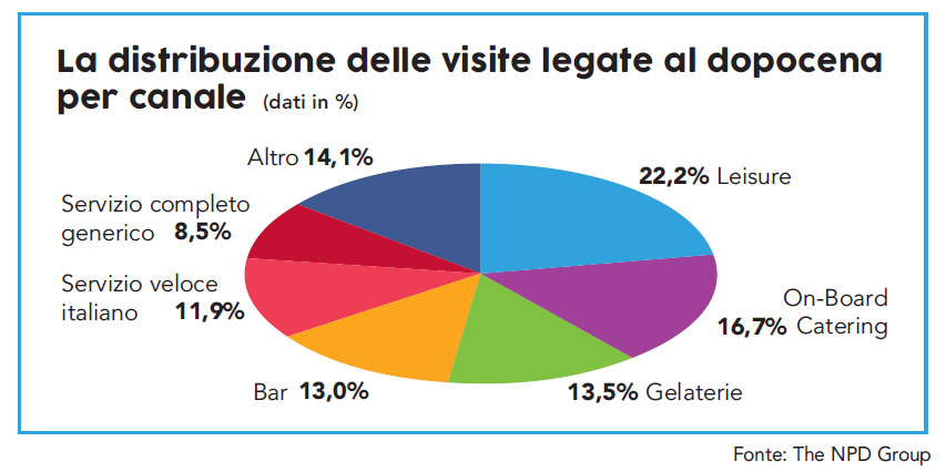segmento del dopo cena ha perso terreno. «Tra luglio 2017 e giugno 2018 – sostiene Matteo Figura, responsabile Foodservice NPD in Italia –, le visite legate a questa occasione di consumo hanno scontato una flessione del 2,5% rispetto all’omologo periodo precedente. E non va meglio neppure se si analizza l’andamento della spesa, che nei dodici mesi in analisi diminuisce del 2,7%». Come detto, principale imputata di questa flessione è la cena, che oltre ad avere eroso quote di mercato all’aperitivo, sottrae consumazioni anche alla fascia notturna. «Il francescanesimo che, complice la crisi, ha caratterizzato gli ultimi anni – afferma Figura – ha oggi lasciato il posto a una ritrovata voglia di vivere esperienze più strutturate. Ne consegue che lo spuntino leggero, un tempo consumato alle 21 o alle 22, spesso ora diventa un pasto completo. E così accade anche che le ordinazioni del dopo cena scivolino verso le ore piccole».