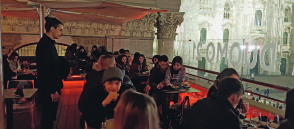 mood speciale, comodi, sentendosi a casa propria. “Qui vengono per il panorama. Ma oggi anche l’interno è fortemente frequentato”, precisa Grimoldi. Altro che via della Spiga, è questo il vero salotto di Milano, pronto a ospitare eventi privati o feste per una ampia varietà di gruppi. Grimoldi è anche chiaro ed esplicito nel raccontare quando, come e perché sia arrivata la decisione di acquistare Terrazza Duomo 21. “Abbiamo contattato Alessandro Rosso, titolare di TownHouse (società detentrice del marchio Duomo 21). Ci siamo conosciuti ad Expo. La location era unica, splendida, eccezionale se presa in mano e spinta nel modo giusto. Tenendo uno standard qualitativo alto, il business avrebbe reagito molto bene. Dopo due anni gli ho fatto un’offerta per acquisire il marchio. Abbiamo rilevato Duomo 21, fatto un accordo con i dipendenti e mantenuto l’intero staff. La location è unica e l’azienda è sana, può sviluppare buoni numeri. C’è gloria, c’è prestigio, qui”.