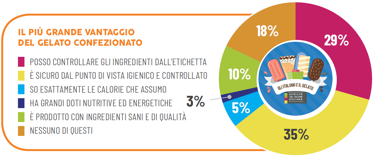 Il gelato rappresenta un vanto per l’Italia: siamo i primi produttori in Europa, seguiti da Germania, Francia e Spagna. Gli analisti di settore la definiscono una “referenza anti ciclica”, che si consuma tutto l’anno, sebbene il picco dei consumi sia naturalmente legato ai mesi estivi. La produzione di gelati industriali nel nostro Paese ha totalizzato nel 2017 le 213.125 tonnellate (Dati Istituto del Gelato Italiano) per un valore complessivo di 2.063,9 milioni di euro. E se il 2017 è stato per il settore dei gelati un anno estremamente positivo (si parla di circa 3 milioni e mezzo di coni, coppette, ghiaccioli & co., per un totale di 3 kg procapite), nel 2018 i risultati hanno rimarcato ancora una volta la bontà del gelato confezionato, ovvero quel gelato pensato dall’industria per rispondere alle esigenze dei consumatori con una produzione costante di prodotti ottimi, sicuri e con gusti vari nel corso di tute le stagioni. Infatti, secondo una recente indagine svolta da Doxa per conto di IGI, il gelato confezionato sembra essere preferito dal campione (35%) perché ritenuto particolarmente controllato e sicuro dal punto di vista igienico, trasparente grazie a un’etichetta chiara (29%), prodotto con ingredienti sani e di qualità (11%) e porzionato in maniera da conoscere esattamente i valori nutrizionali assunti (5%). “Il gelato è un prodotto che ha una rilevante valenza nutrizionale perché contiene nutrienti importanti, come proteine ad alto valore biologico, proteine del latte e dell’uovo, carboidrati semplici,