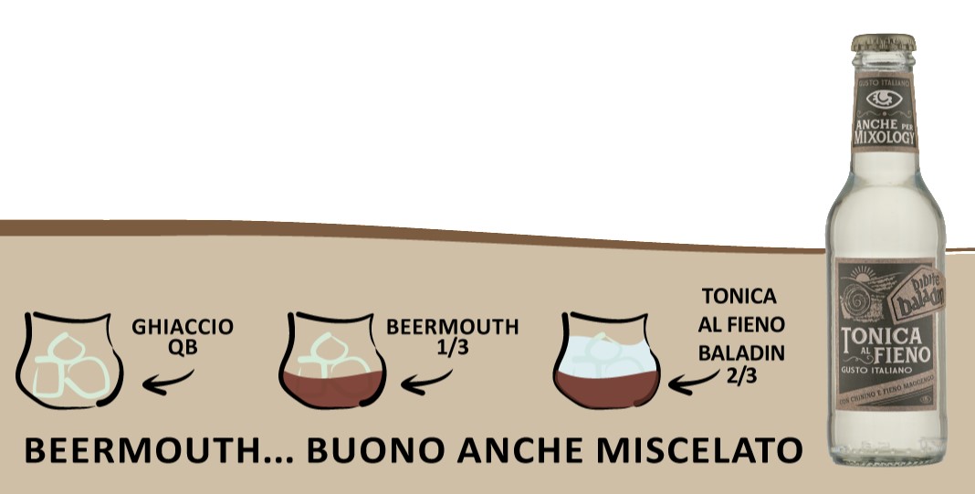 Abbinamenti: Ottimo aperitivo, si abbina perfettamente con stuzzichini e appetizer. Perfetto liscio a fine pasto è ottimo per la miscelazione. Provatelo servito in un bicchiere da circa 30 cl con la Tonica al Fieno Baladin: ⅓ di Beermouth + ⅔ di acqua tonica al fieno Baladin + ghiaccio.