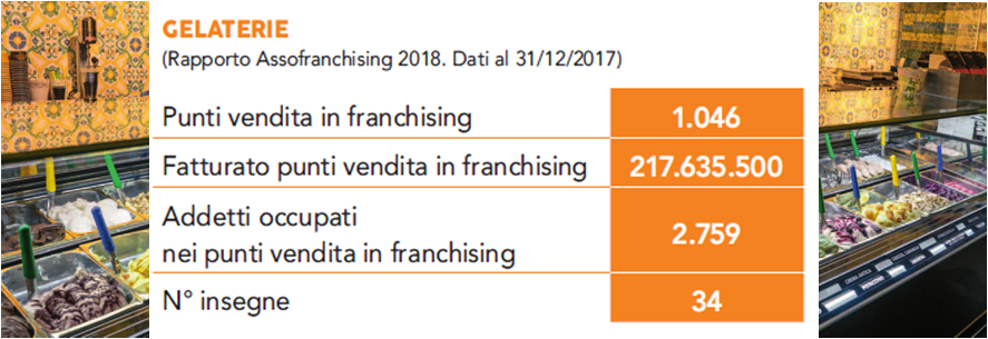 Esistono 34 insegne di gelaterie in franchising, che registrano complessivamente 1.046 punti vendita. Il numero si riferisce a esercizi che svolgono unicamente l’attività di gelateria. Allargando la forbice a insegne affini, come bar, yogurterie, pasticcerie e caffetterie, le insegne salgono a 59 con 1.509 punti vendita.