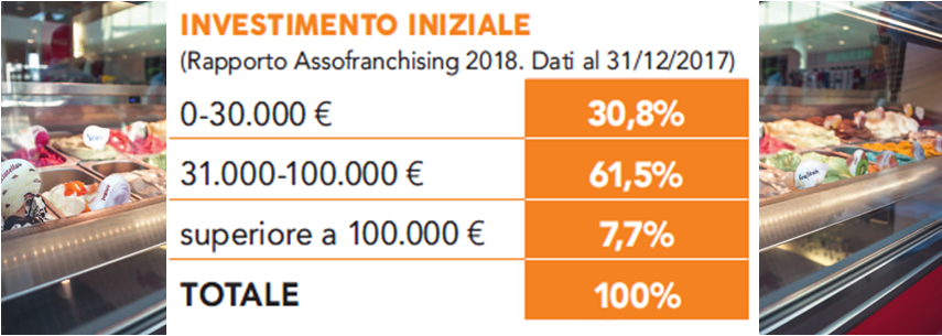 Il 61% delle gelaterie in franchising prevede un investimento che va dai 31.000 ai 100.000 euro. Il 30,8 % richiede invece un investimento fino a 30.000 euro.